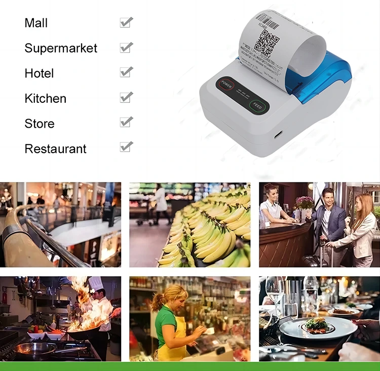 A Thermal Bluetooth vezeték nélküli tinta nélküli nyomtatók egyre népszerűbbek, és széles körben használják számos iparágban, például a kiskereskedelemben, a vendéglátásban, a logisztikában és az egészségügyben. A kiskereskedelmi ágazat felhasználhatja a vásárlási bizonylatok gyors kinyomtatására. A vendéglátóiparban azonnal ki tudja nyomtatni a rendeléseket. A logisztikai iparban expressz szállítási címkéket tud nyomtatni. Az orvosi iparban képes orvosi feljegyzéseket és recepteket nyomtatni. Ezek az alkalmazási forgatókönyvek mind bemutatják a termikus Bluetooth nyomtatók nagy hatékonyságát és praktikumát.