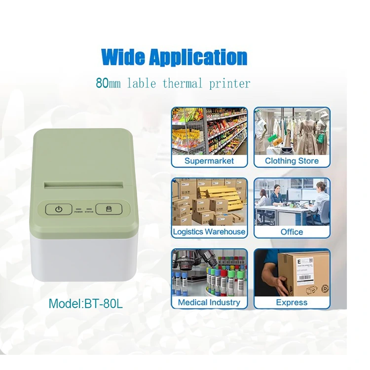 Színes termikus címkenyomtatónk tervezési koncepciója, hogy lehetővé tegyük az ügyfelek számára, hogy gyári raktárrendszerekben, kiskereskedelmi üzletekben, kisméretű címkéket nyomtatni, kis címkéket, vonalkódokat, szállítási jeleket, matricákat stb. tudjanak nyomtatni. A 80L-es modell 20-80 mm-es szélességben képes nyomtatni, így alkalmas különféle igényű ügyfelek számára. Kompakt méretűre tervezték, így kényelmesen szállítható és elhelyezhető.